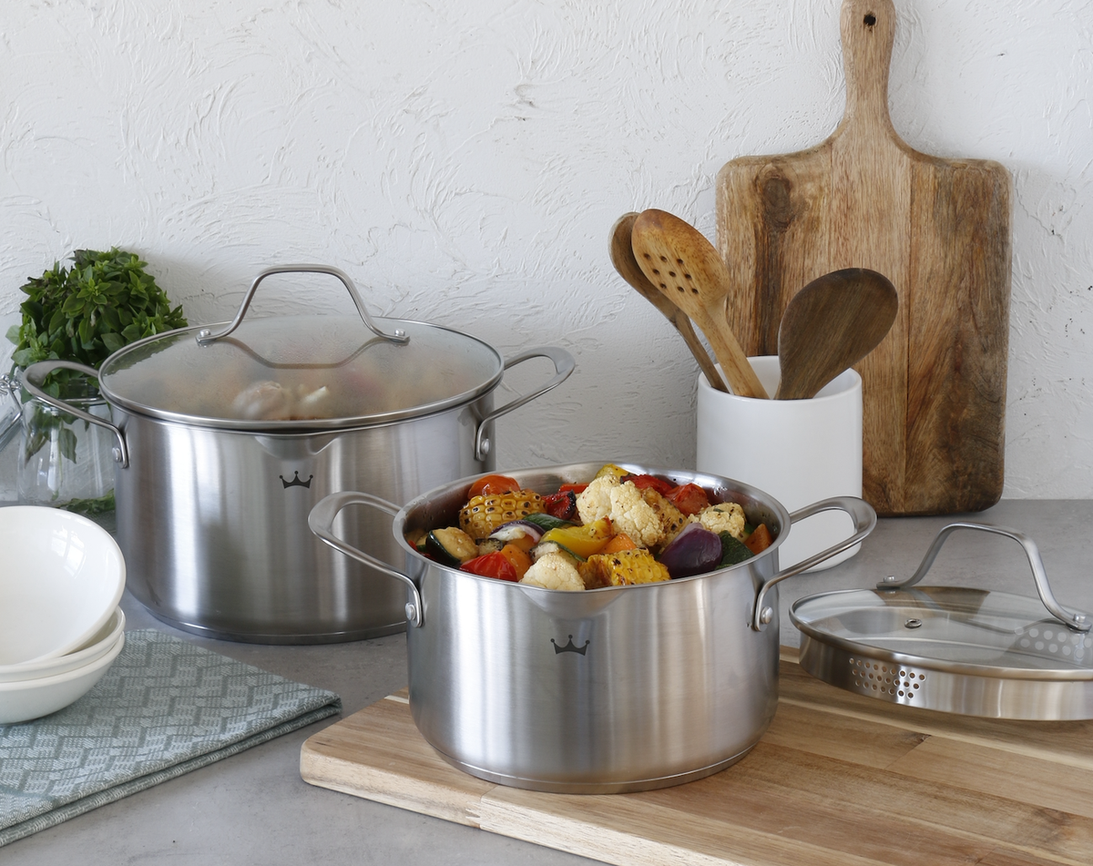 Посуда из коллекции Royal Küchen — именно из такой стали. Материал не вступает в реакцию с продуктами. Например, если вы готовите томатный соус в ковшике или варите макароны, их вкус останется неизменным.